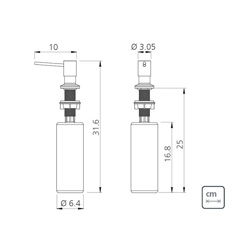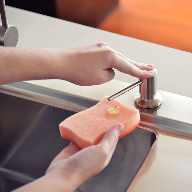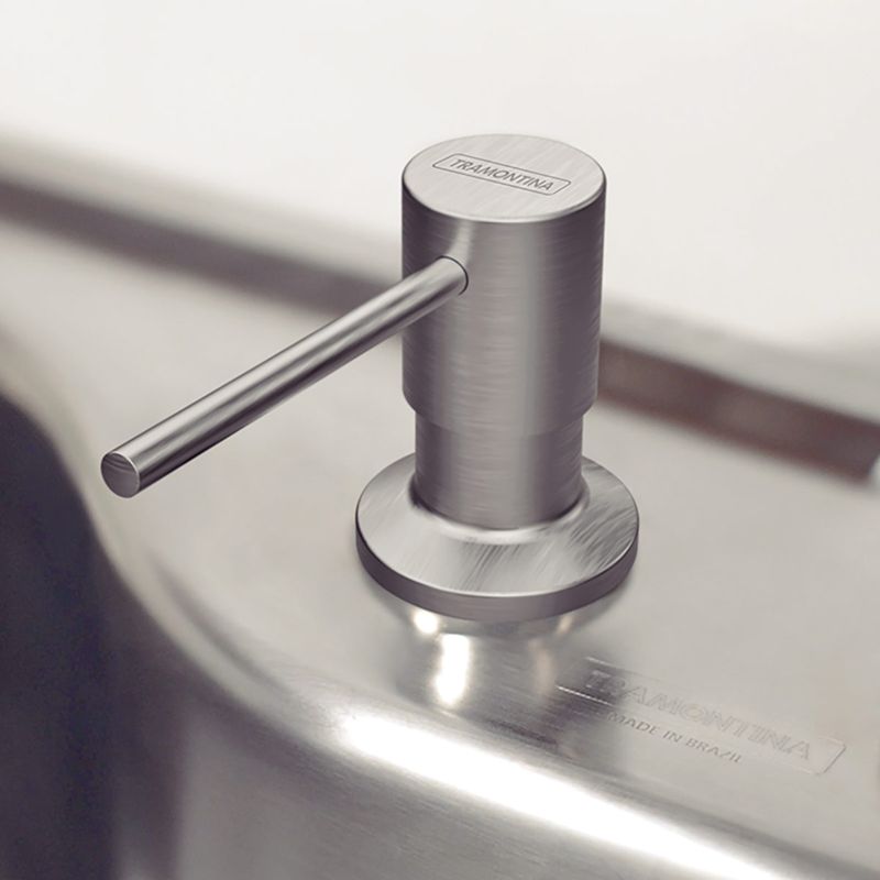 Esta pieza está fabricada en acero inoxidable con recipiente plástico, que cuenta con una capacidad de 500 ml para el jabón líquido, proporcionando una limpieza más práctica y ágil. Facilita el lavado de la vajilla y aprovecha mejor el espacio en la mesada.