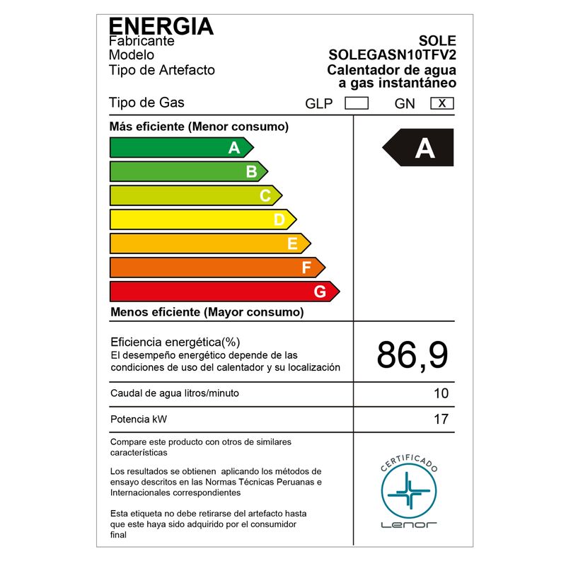 La terma SOLEGASN10TFV2, cuentan con hasta 6 sistemas de seguridad con los más altos estándares internacionales que te brindarán la tranquilidad y comodidad que necesitas en tu hogar. Además, esta terma cuenta con encendido automático, lo que te permitirá disfrutar de agua caliente ni bien abras la llave de la ducha.Disfruta del total ahorro con un combustible económico y vive la experiencia única del confort que te brinda el agua caliente ilimitada y sin espera.No lo pienses mas y logra ese paso a lo moderno y magnífico que buscas para tu hogar. ¡Innova con SOLE y CASSINELLI.COM!