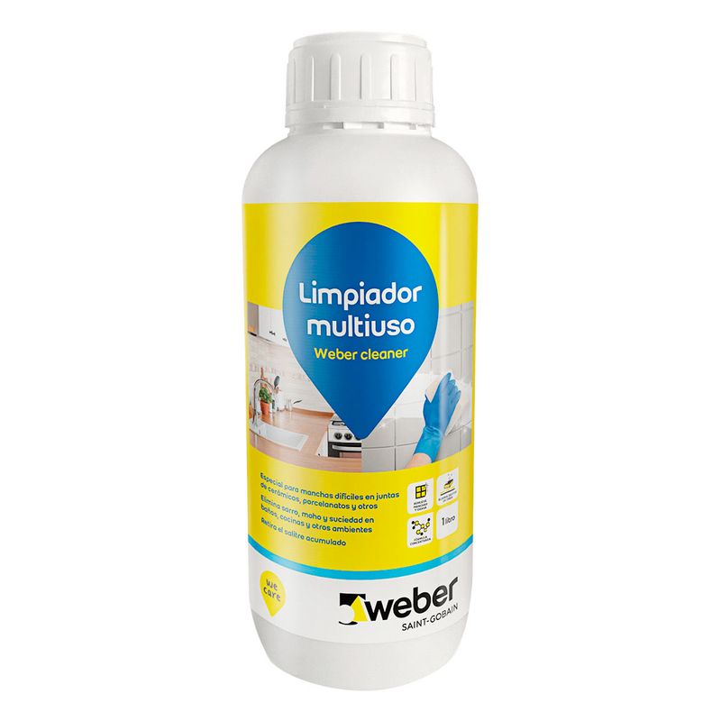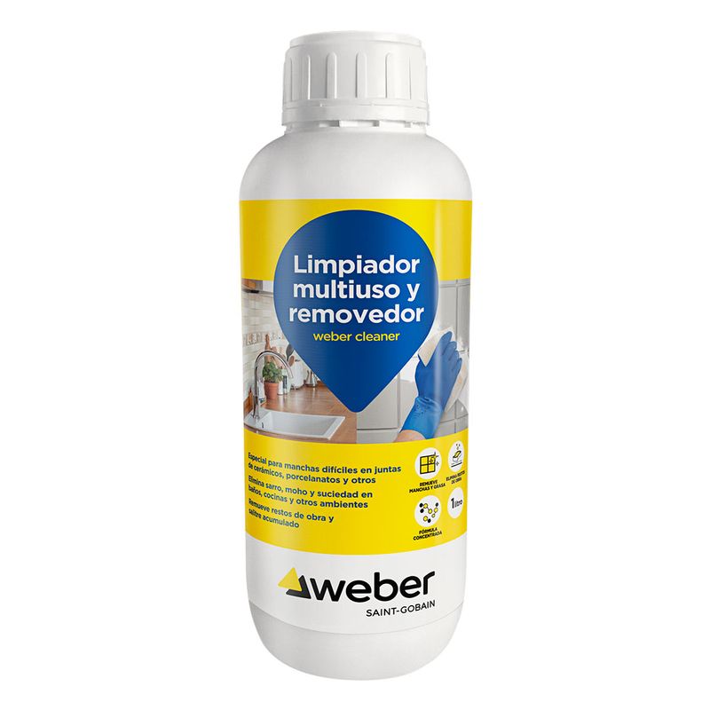 Weber Cleaner, es un poderoso limpiador a base de ácidos orgánicos/inorgánicos (fosfórico, clorhídrico), tensioactivos no iónicos, agentes desincrustantes, para remover manchas difíciles en juntas de fraguas, pisos de cerámica, lavaderos, piscinas, ladrillos caravista y diversos acabados cementicios.